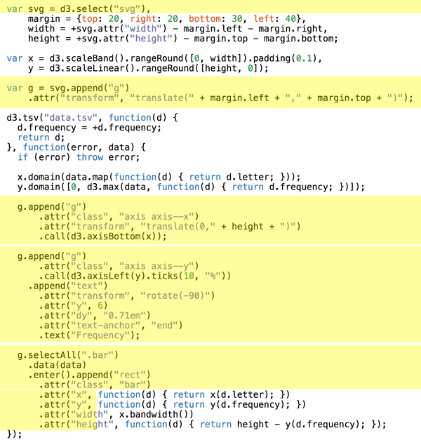 d3.tsv("data.tsv",function (d) {d.frequency = +d.frequencyreturn d},function (error, data) {if (error) throw errorx.domain(data.map(function (d) {return d.letter}))y.domain([0,d3.max(data, function (d) {return d.frequency}),])g.append("g").attr("class", "axis axis--x").attr("transform", "translate(0," + height + ")").call(d3.axisBottom(x))g.append("g").attr("class", "axis axis--y").call(d3.axisLeft(y).ticks(10, "%")).append("text").attr("transform", "rotate(-90)").attr("y", 6).attr("dy", "0.71em").attr("text-anchor", "end").text("Frequency")g.selectAll(".bar").data(data).enter().append("rect").attr("class", "bar").attr("x", function (d) {return x(d.letter)}).attr("y", function (d) {return y(d.frequency)}).attr("width", x.bandwidth()).attr("height", function (d) {return height - y(d.frequency)})})
